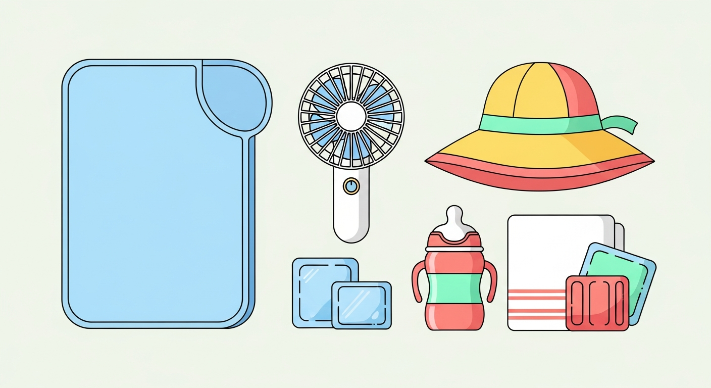 赤ちゃんの熱中症対策は、「グッズの準備」「環境管理」「こまめな水分補給」の3つを軸に進めましょう。ベビーカー用保冷シートやクリップ式扇風機、UVカット帽子など手頃な価格で手に入るアイテムを組み合わせるだけで、暑い夏のお出かけをぐんと快適にできます。